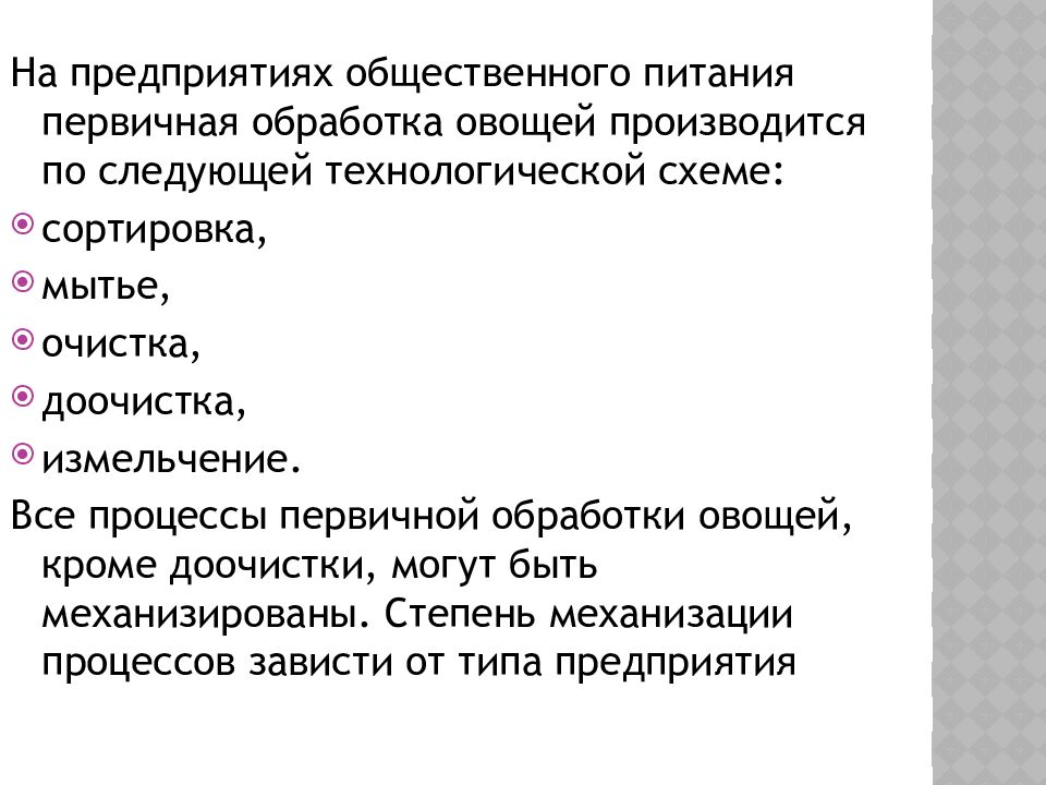 На предприятиях общественного питания первичная обработка овощей производится по следующей технологической схеме: сортировка, мытье, очистка, доочистка, измельчение. Все процессы первичной обработки овощей, кроме доочистки, могут быть механизированы. Степень механизации процессов зависти от типа предприятия