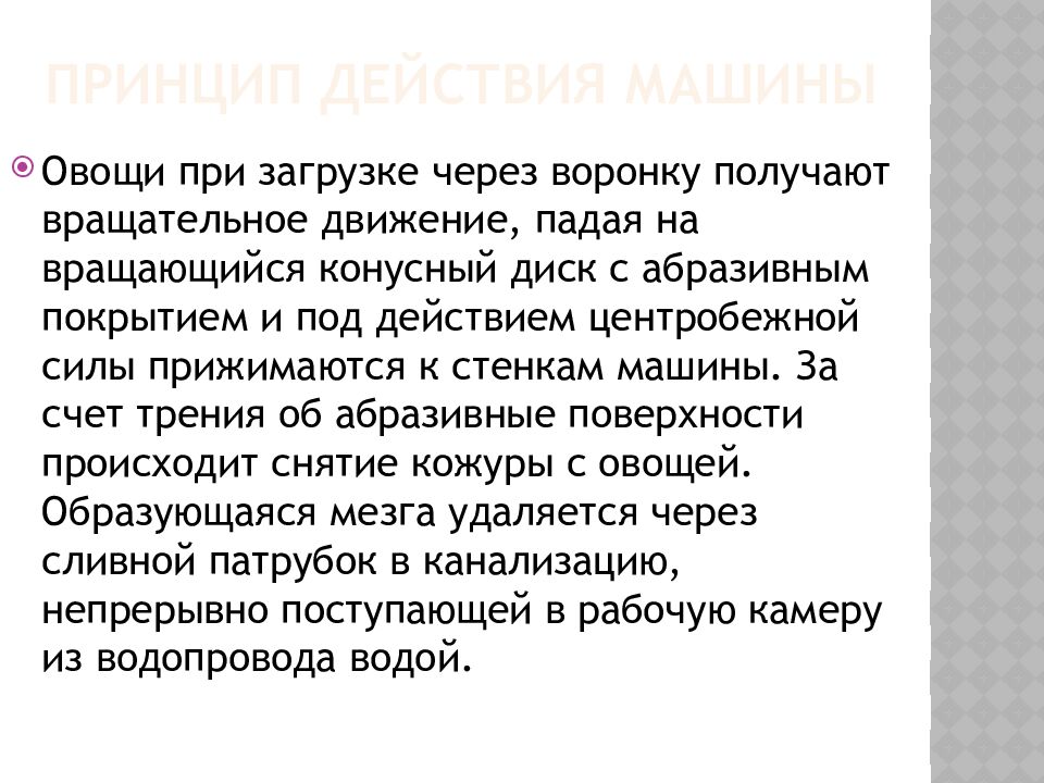Овощи при загрузке через воронку получают вращательное движение, падая на вращающийся конусный диск с абразивным покрытием и под действием центробежной силы прижимаются к стенкам машины. За счет трения об абразивные поверхности происходит снятие кожуры с овощей. Образующаяся мезга удаляется через сливной патрубок в канализацию, непрерывно поступающей в рабочую камеру из водопровода водой.