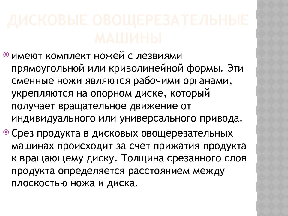 имеют комплект ножей с лезвиями прямоугольной или криволинейной формы. Эти сменные ножи являются рабочими органами, укрепляются на опорном диске, который получает вращательное движение от индивидуального или универсального привода. Срез продукта в дисковых овощерезательных машинах происходит за счет прижатия продукта к вращающему диску. Толщина срезанного слоя продукта определяется расстоянием между плоскостью ножа и диска.