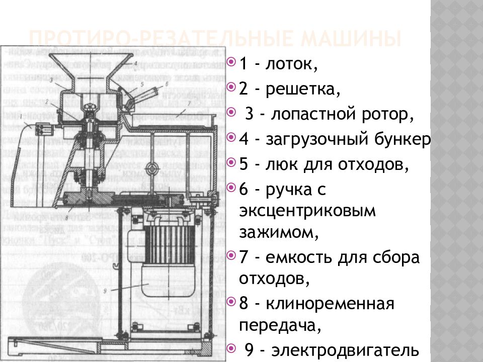 1 - лоток, 2 - решетка, 3 - лопастной ротор, 4 - загрузочный бункер 5 - люк для отходов, 6 - ручка с эксцентриковым зажимом, 7 - емкость для сбора отходов, 8 - клиноременная передача, 9 - электродвигатель