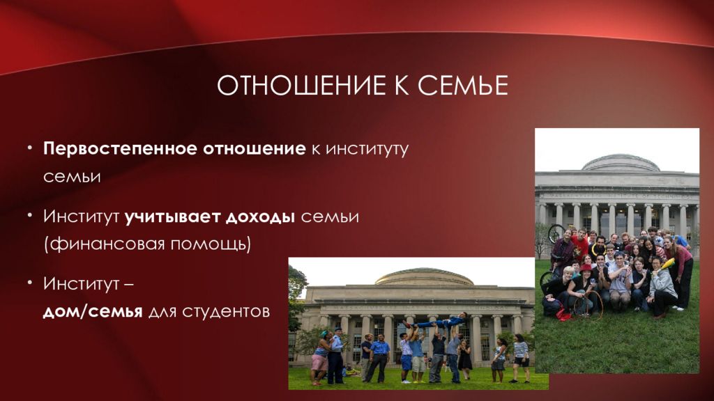 Первостепенное отношение к институту семьи Институт учитывает доходы семьи (финансовая помощь) Институт – дом/семья для студентов