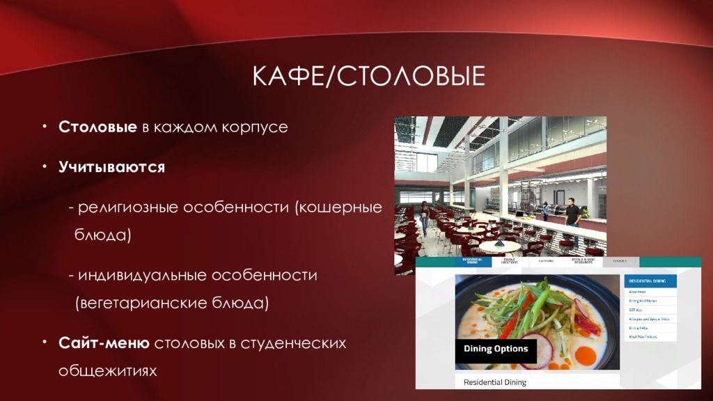 Столовые в каждом корпусе Учитываются - религиозные особенности (кошерные блюда) - индивидуальные особенности (вегетарианские блюда) Сайт-меню столовых в студенческих общежитиях