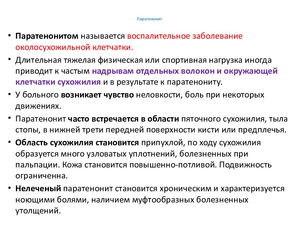 Паратенонитом называется воспалительное заболевание околосухожильной клетчатки. Длительная тяжелая физическая или спортивная нагрузка иногда приводит к частым надрывам отдельных волокон и окружающей клетчатки сухожилия и в результате к паратенониту. У больного возникает чувство неловкости, боль при некоторых движениях. Паратенонит часто встречается в области пяточного сухожилия, тыла стопы, в нижней трети передней поверхности кисти или предплечья. Область сухожилия становится припухлой, по ходу сухожилия образуется много узловатых уплотнений, болезненных при пальпации. Кожа становится повышенно-потливой. Подвижность ограниченна. Нелеченый паратенонит становится хроническим и характеризуется ноющими болями, наличием муфтообразных болезненных утолщений.