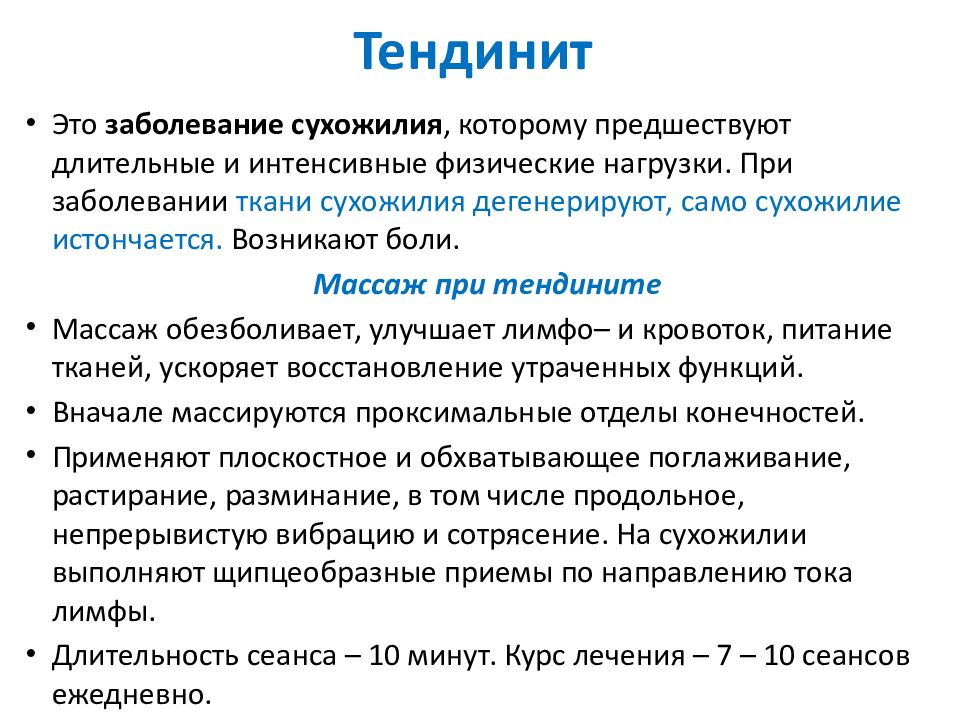 Это заболевание сухожилия, которому предшествуют длительные и интенсивные физические нагрузки. При заболевании ткани сухожилия дегенерируют, само сухожилие истончается. Возникают боли. Массаж при тендините Массаж обезболивает, улучшает лимфо – и кровоток, питание тканей, ускоряет восстановление утраченных функций. Вначале массируются проксимальные отделы конечностей. Применяют плоскостное и обхватывающее поглаживание, растирание, разминание, в том числе продольное, непрерывистую вибрацию и сотрясение. На сухожилии выполняют щипцеобразные приемы по направлению тока лимфы. Длительность сеанса – 10 минут. Курс лечения – 7 – 10 сеансов ежедневно.