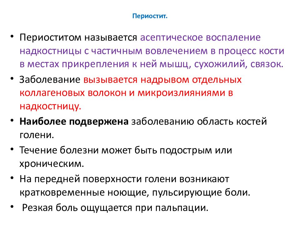 Периоститом называется асептическое воспаление надкостницы с частичным вовлечением в процесс кости в местах прикрепления к ней мышц, сухожилий, связок. Заболевание вызывается надрывом отдельных коллагеновых волокон и микроизлияниями в надкостницу. Наиболее подвержена заболеванию область костей голени. Течение болезни может быть подострым или хроническим. На передней поверхности голени возникают кратковременные ноющие, пульсирующие боли. Резкая боль ощущается при пальпации.