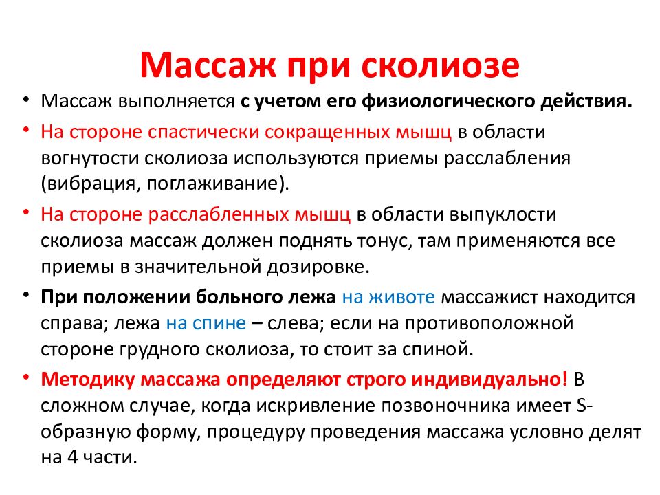 Массаж выполняется с учетом его физиологического действия. На стороне спастически сокращенных мышц в области вогнутости сколиоза используются приемы расслабления (вибрация, поглаживание). На стороне расслабленных мышц в области выпуклости сколиоза массаж должен поднять тонус, там применяются все приемы в значительной дозировке. При положении больного лежа на животе массажист находится справа; лежа на спине – слева; если на противоположной стороне грудного сколиоза, то стоит за спиной. Методику массажа определяют строго индивидуально! В сложном случае, когда искривление позвоночника имеет S-образную форму, процедуру проведения массажа условно делят на 4 части.