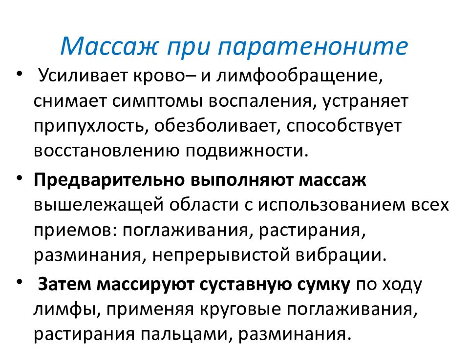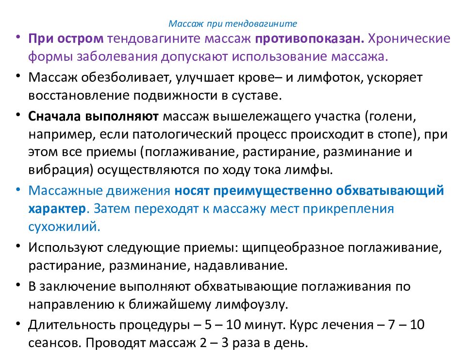 При остром тендовагините массаж противопоказан. Хронические формы заболевания допускают использование массажа. Массаж обезболивает, улучшает крове– и лимфоток, ускоряет восстановление подвижности в суставе. Сначала выполняют массаж вышележащего участка (голени, например, если патологический процесс происходит в стопе), при этом все приемы (поглаживание, растирание, разминание и вибрация) осуществляются по ходу тока лимфы. Массажные движения носят преимущественно обхватывающий характер. Затем переходят к массажу мест прикрепления сухожилий. Используют следующие приемы: щипцеобразное поглаживание, растирание, разминание, надавливание. В заключение выполняют обхватывающие поглаживания по направлению к ближайшему лимфоузлу. Длительность процедуры – 5 – 10 минут. Курс лечения – 7 – 10 сеансов. Проводят массаж 2 – 3 раза в день.
