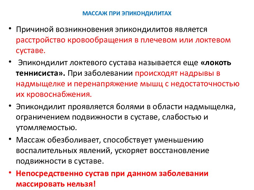 Причиной возникновения эпикондилитов является расстройство кровообращения в плечевом или локтевом суставе. Эпикондилит локтевого сустава называется еще «локоть теннисиста». При заболевании происходят надрывы в надмыщелке и перенапряжение мышц с недостаточностью их кровоснабжения. Эпикондилит проявляется болями в области надмыщелка, ограничением подвижности в суставе, слабостью и утомляемостью. Массаж обезболивает, способствует уменьшению воспалительных явлений, ускоряет восстановление подвижности в суставе. Непосредственно сустав при данном заболевании массировать нельзя!