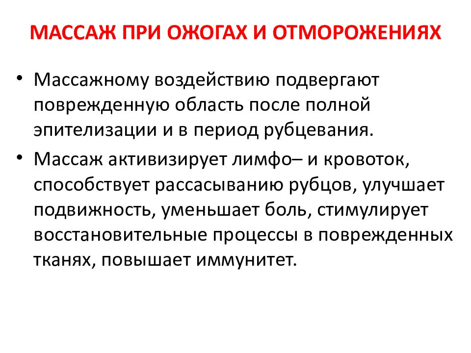 Массажному воздействию подвергают поврежденную область после полной эпителизации и в период рубцевания. Массаж активизирует лимфо – и кровоток, способствует рассасыванию рубцов, улучшает подвижность, уменьшает боль, стимулирует восстановительные процессы в поврежденных тканях, повышает иммунитет.