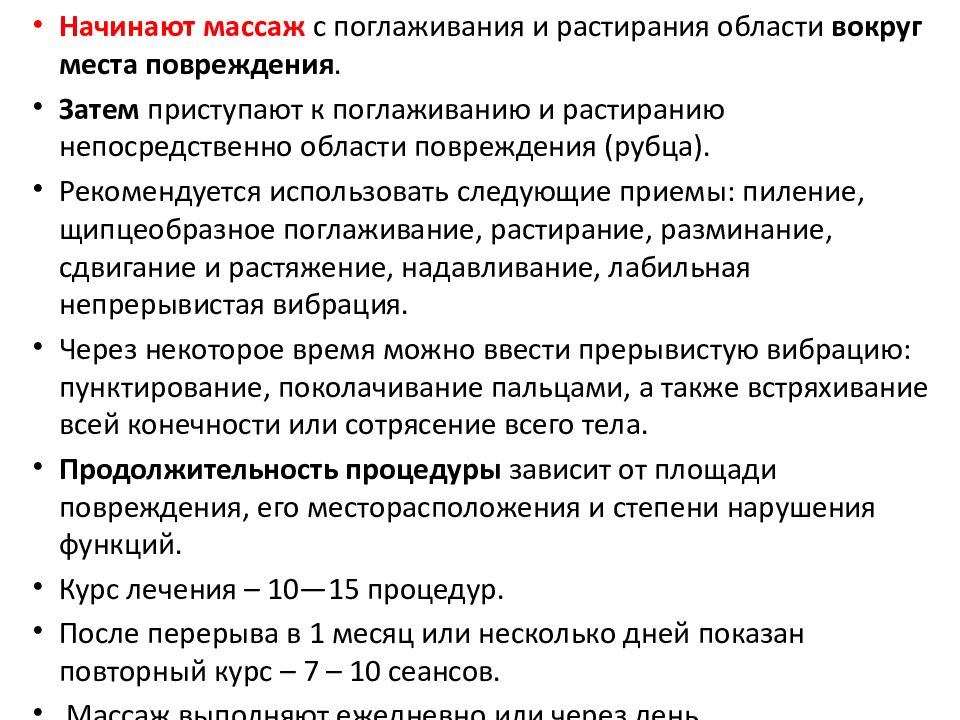 Начинают массаж с поглаживания и растирания области вокруг места повреждения. Затем приступают к поглаживанию и растиранию непосредственно области повреждения (рубца). Рекомендуется использовать следующие приемы: пиление, щипцеобразное поглаживание, растирание, разминание, сдвигание и растяжение, надавливание, лабильная непрерывистая вибрация. Через некоторое время можно ввести прерывистую вибрацию: пунктирование, поколачивание пальцами, а также встряхивание всей конечности или сотрясение всего тела. Продолжительность процедуры зависит от площади повреждения, его месторасположения и степени нарушения функций. Курс лечения – 10—15 процедур. После перерыва в 1 месяц или несколько дней показан повторный курс – 7 – 10 сеансов. Массаж выполняют ежедневно или через день.