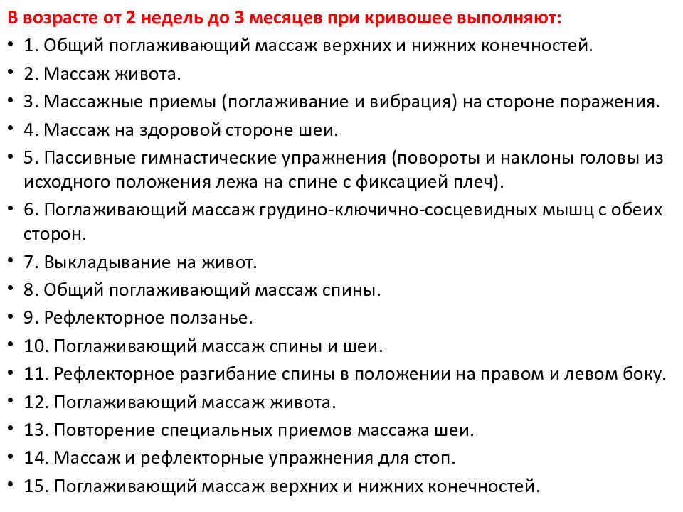 В возрасте от 2 недель до 3 месяцев при кривошее выполняют: 1. Общий поглаживающий массаж верхних и нижних конечностей. 2. Массаж живота. 3. Массажные приемы (поглаживание и вибрация) на стороне поражения. 4. Массаж на здоровой стороне шеи. 5. Пассивные гимнастические упражнения (повороты и наклоны головы из исходного положения лежа на спине с фиксацией плеч). 6. Поглаживающий массаж грудино-ключично-сосцевидных мышц с обеих сторон. 7. Выкладывание на живот. 8. Общий поглаживающий массаж спины. 9. Рефлекторное ползанье. 10. Поглаживающий массаж спины и шеи. 11. Рефлекторное разгибание спины в положении на правом и левом боку. 12. Поглаживающий массаж живота. 13. Повторение специальных приемов массажа шеи. 14. Массаж и рефлекторные упражнения для стоп. 15. Поглаживающий массаж верхних и нижних конечностей.