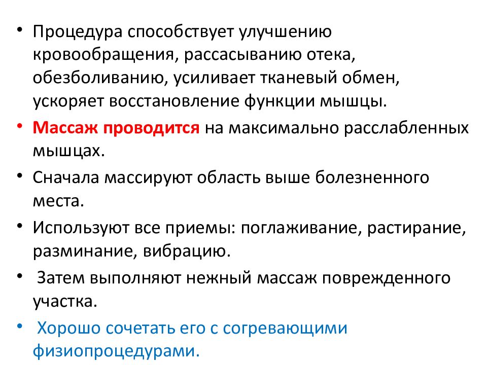 Процедура способствует улучшению кровообращения, рассасыванию отека, обезболиванию, усиливает тканевый обмен, ускоряет восстановление функции мышцы. Массаж проводится на максимально расслабленных мышцах. Сначала массируют область выше болезненного места. Используют все приемы: поглаживание, растирание, разминание, вибрацию. Затем выполняют нежный массаж поврежденного участка. Хорошо сочетать его с согревающими физиопроцедурами.