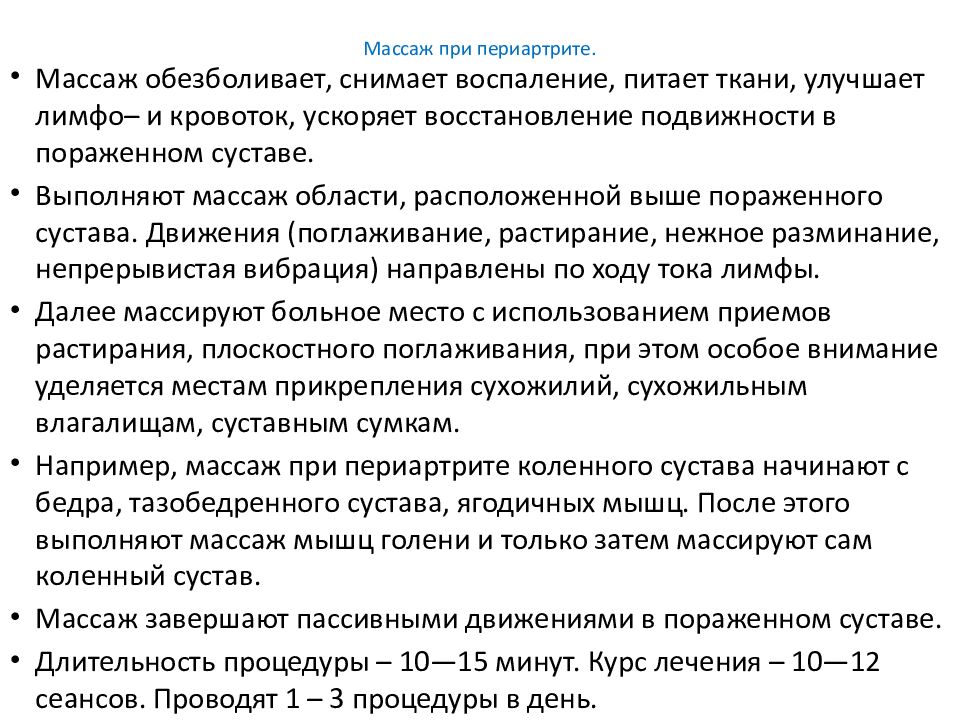 Массаж обезболивает, снимает воспаление, питает ткани, улучшает лимфо – и кровоток, ускоряет восстановление подвижности в пораженном суставе. Выполняют массаж области, расположенной выше пораженного сустава. Движения (поглаживание, растирание, нежное разминание, непрерывистая вибрация) направлены по ходу тока лимфы. Далее массируют больное место с использованием приемов растирания, плоскостного поглаживания, при этом особое внимание уделяется местам прикрепления сухожилий, сухожильным влагалищам, суставным сумкам. Например, массаж при периартрите коленного сустава начинают с бедра, тазобедренного сустава, ягодичных мышц. После этого выполняют массаж мышц голени и только затем массируют сам коленный сустав. Массаж завершают пассивными движениями в пораженном суставе. Длительность процедуры – 10—15 минут. Курс лечения – 10—12 сеансов. Проводят 1 – 3 процедуры в день.