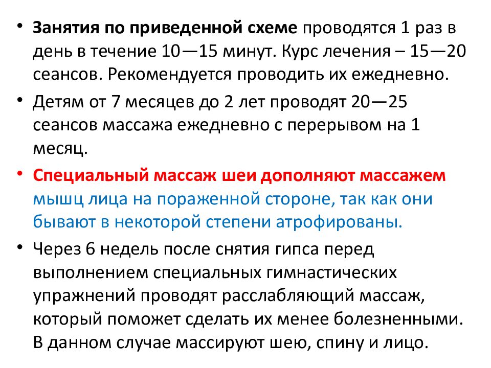 Занятия по приведенной схеме проводятся 1 раз в день в течение 10—15 минут. Курс лечения – 15—20 сеансов. Рекомендуется проводить их ежедневно. Детям от 7 месяцев до 2 лет проводят 20—25 сеансов массажа ежедневно с перерывом на 1 месяц. Специальный массаж шеи дополняют массажем мышц лица на пораженной стороне, так как они бывают в некоторой степени атрофированы. Через 6 недель после снятия гипса перед выполнением специальных гимнастических упражнений проводят расслабляющий массаж, который поможет сделать их менее болезненными. В данном случае массируют шею, спину и лицо.