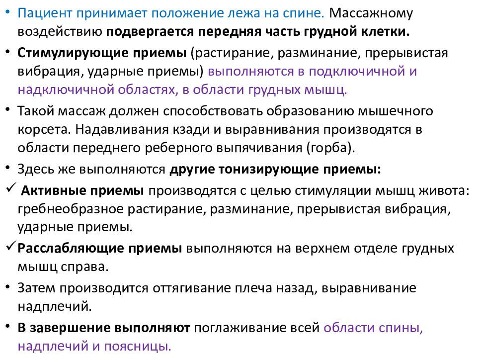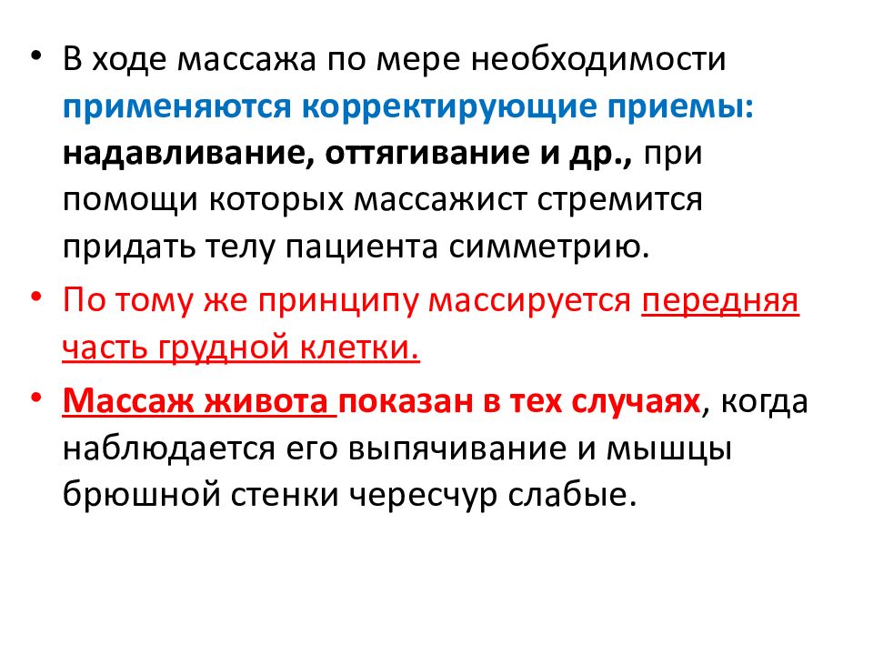 В ходе массажа по мере необходимости применяются корректирующие приемы: надавливание, оттягивание и др., при помощи которых массажист стремится придать телу пациента симметрию. По тому же принципу массируется передняя часть грудной клетки. Массаж живота показан в тех случаях, когда наблюдается его выпячивание и мышцы брюшной стенки чересчур слабые.