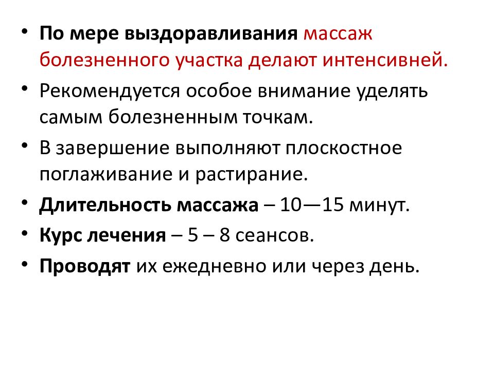 По мере выздоравливания массаж болезненного участка делают интенсивней. Рекомендуется особое внимание уделять самым болезненным точкам. В завершение выполняют плоскостное поглаживание и растирание. Длительность массажа – 10—15 минут. Курс лечения – 5 – 8 сеансов. Проводят их ежедневно или через день.