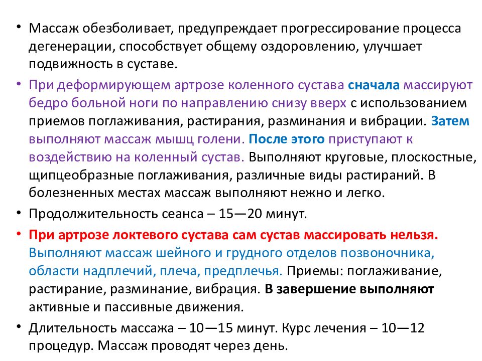 Массаж обезболивает, предупреждает прогрессирование процесса дегенерации, способствует общему оздоровлению, улучшает подвижность в суставе. При деформирующем артрозе коленного сустава сначала массируют бедро больной ноги по направлению снизу вверх с использованием приемов поглаживания, растирания, разминания и вибрации. Затем выполняют массаж мышц голени. После этого приступают к воздействию на коленный сустав. Выполняют круговые, плоскостные, щипцеобразные поглаживания, различные виды растираний. В болезненных местах массаж выполняют нежно и легко. Продолжительность сеанса – 15—20 минут. При артрозе локтевого сустава сам сустав массировать нельзя. Выполняют массаж шейного и грудного отделов позвоночника, области надплечий, плеча, предплечья. Приемы: поглаживание, растирание, разминание, вибрация. В завершение выполняют активные и пассивные движения. Длительность массажа – 10—15 минут. Курс лечения – 10—12 процедур. Массаж проводят через день.