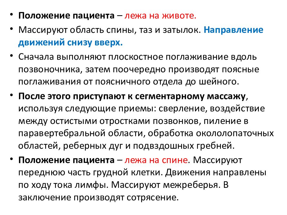 Положение пациента – лежа на животе. Массируют область спины, таз и затылок. Направление движений снизу вверх. Сначала выполняют плоскостное поглаживание вдоль позвоночника, затем поочередно производят поясные поглаживания от поясничного отдела до шейного. После этого приступают к сегментарному массажу, используя следующие приемы: сверление, воздействие между остистыми отростками позвонков, пиление в паравертебральной области, обработка окололопаточных областей, реберных дуг и подвздошных гребней. Положение пациента – лежа на спине. Массируют переднюю часть грудной клетки. Движения направлены по ходу тока лимфы. Массируют межреберья. В заключение производят сотрясение.