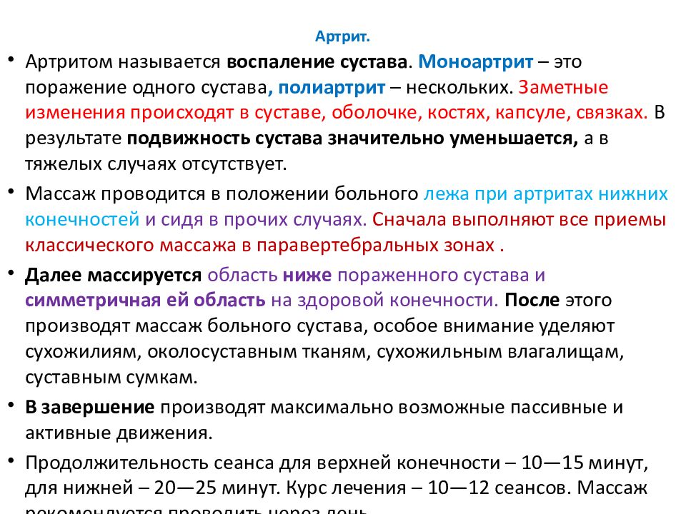 Артритом называется воспаление сустава. Моноартрит – это поражение одного сустава, полиартрит – нескольких. Заметные изменения происходят в суставе, оболочке, костях, капсуле, связках. В результате подвижность сустава значительно уменьшается, а в тяжелых случаях отсутствует. Массаж проводится в положении больного лежа при артритах нижних конечностей и сидя в прочих случаях. Сначала выполняют все приемы классического массажа в паравертебральных зонах. Далее массируется область ниже пораженного сустава и симметричная ей область на здоровой конечности. После этого производят массаж больного сустава, особое внимание уделяют сухожилиям, околосуставным тканям, сухожильным влагалищам, суставным сумкам. В завершение производят максимально возможные пассивные и активные движения. Продолжительность сеанса для верхней конечности – 10—15 минут, для нижней – 20—25 минут. Курс лечения – 10—12 сеансов. Массаж рекомендуется проводить через день.