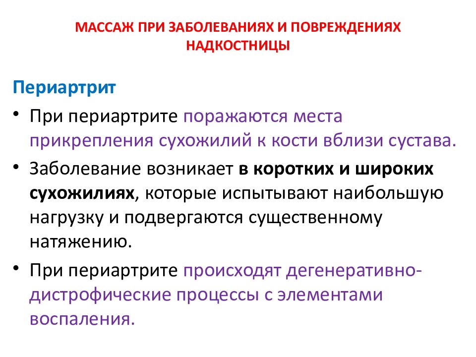 Периартрит При периартрите поражаются места прикрепления сухожилий к кости вблизи сустава. Заболевание возникает в коротких и широких сухожилиях, которые испытывают наибольшую нагрузку и подвергаются существенному натяжению. При периартрите происходят дегенеративно-дистрофические процессы с элементами воспаления.