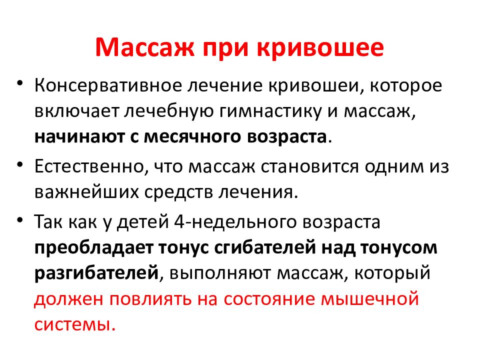 Консервативное лечение кривошеи, которое включает лечебную гимнастику и массаж, начинают с месячного возраста. Естественно, что массаж становится одним из важнейших средств лечения. Так как у детей 4-недельного возраста преобладает тонус сгибателей над тонусом разгибателей, выполняют массаж, который должен повлиять на состояние мышечной системы.