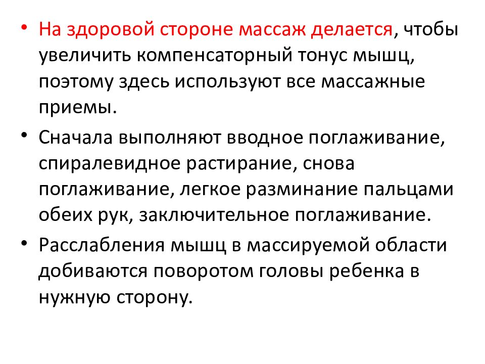 На здоровой стороне массаж делается, чтобы увеличить компенсаторный тонус мышц, поэтому здесь используют все массажные приемы. Сначала выполняют вводное поглаживание, спиралевидное растирание, снова поглаживание, легкое разминание пальцами обеих рук, заключительное поглаживание. Расслабления мышц в массируемой области добиваются поворотом головы ребенка в нужную сторону.