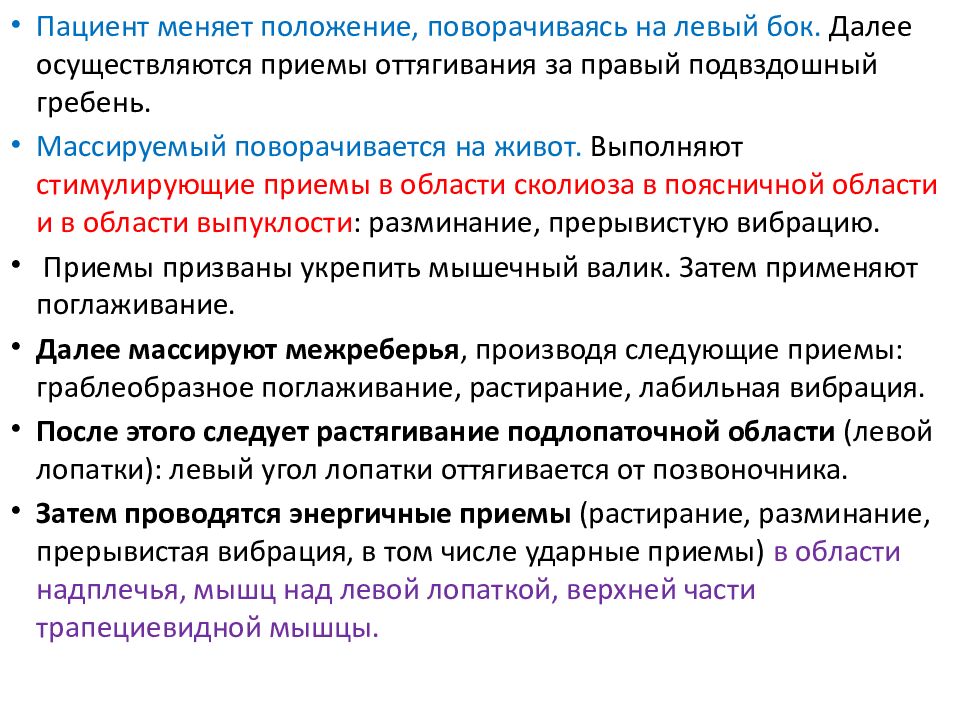 Пациент меняет положение, поворачиваясь на левый бок. Далее осуществляются приемы оттягивания за правый подвздошный гребень. Массируемый поворачивается на живот. Выполняют стимулирующие приемы в области сколиоза в поясничной области и в области выпуклости : разминание, прерывистую вибрацию. Приемы призваны укрепить мышечный валик. Затем применяют поглаживание. Далее массируют межреберья, производя следующие приемы: граблеобразное поглаживание, растирание, лабильная вибрация. После этого следует растягивание подлопаточной области (левой лопатки): левый угол лопатки оттягивается от позвоночника. Затем проводятся энергичные приемы (растирание, разминание, прерывистая вибрация, в том числе ударные приемы) в области надплечья, мышц над левой лопаткой, верхней части трапециевидной мышцы.