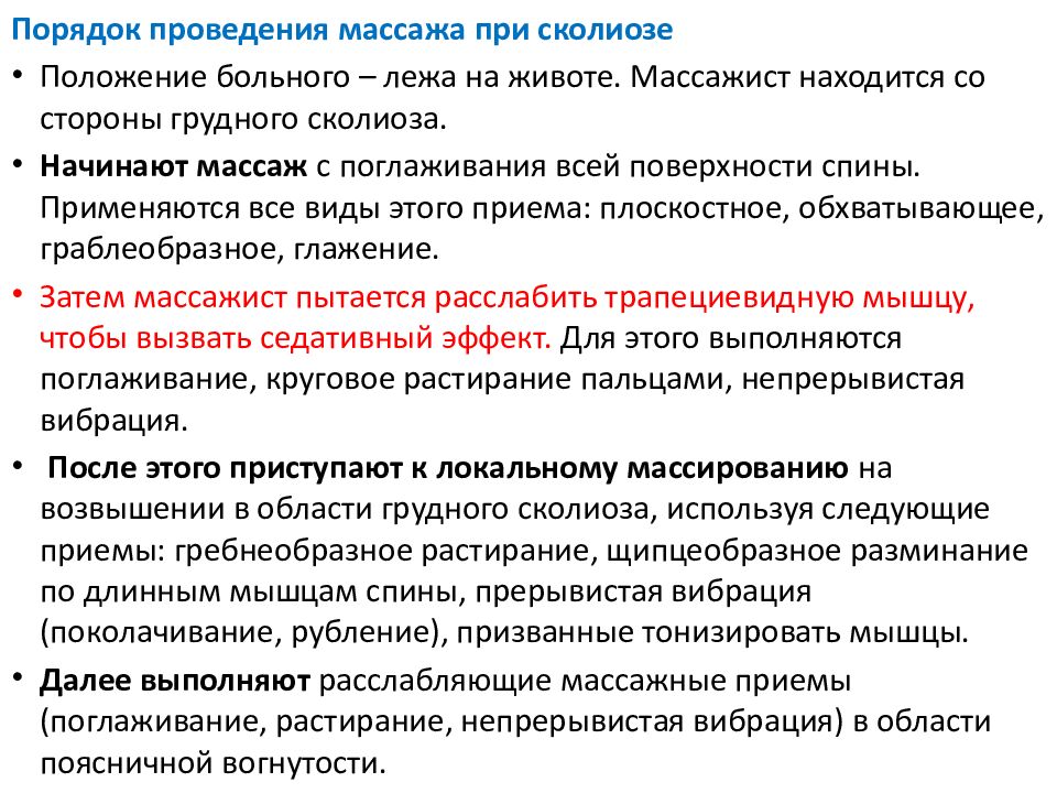 Порядок проведения массажа при сколиозе Положение больного – лежа на животе. Массажист находится со стороны грудного сколиоза. Начинают массаж с поглаживания всей поверхности спины. Применяются все виды этого приема: плоскостное, обхватывающее, граблеобразное, глажение. Затем массажист пытается расслабить трапециевидную мышцу, чтобы вызвать седативный эффект. Для этого выполняются поглаживание, круговое растирание пальцами, непрерывистая вибрация. После этого приступают к локальному массированию на возвышении в области грудного сколиоза, используя следующие приемы: гребнеобразное растирание, щипцеобразное разминание по длинным мышцам спины, прерывистая вибрация (поколачивание, рубление ), призванные тонизировать мышцы. Далее выполняют расслабляющие массажные приемы (поглаживание, растирание, непрерывистая вибрация) в области поясничной вогнутости.