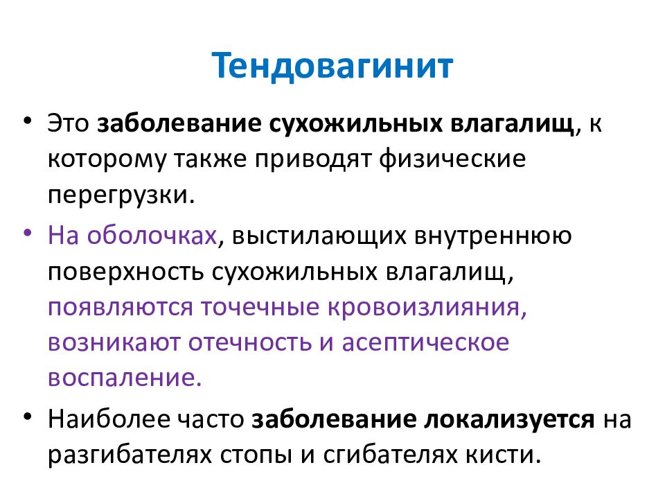 Это заболевание сухожильных влагалищ, к которому также приводят физические перегрузки. На оболочках, выстилающих внутреннюю поверхность сухожильных влагалищ, появляются точечные кровоизлияния, возникают отечность и асептическое воспаление. Наиболее часто заболевание локализуется на разгибателях стопы и сгибателях кисти.