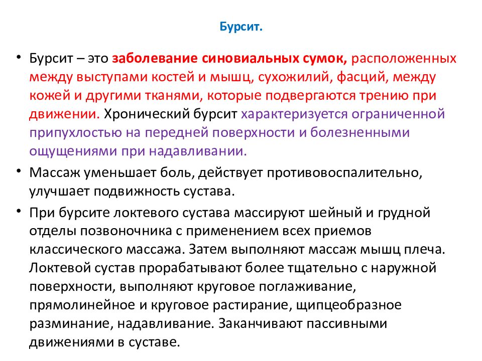 Бурсит – это заболевание синовиальных сумок, расположенных между выступами костей и мышц, сухожилий, фасций, между кожей и другими тканями, которые подвергаются трению при движении. Хронический бурсит характеризуется ограниченной припухлостью на передней поверхности и болезненными ощущениями при надавливании. Массаж уменьшает боль, действует противовоспалительно, улучшает подвижность сустава. При бурсите локтевого сустава массируют шейный и грудной отделы позвоночника с применением всех приемов классического массажа. Затем выполняют массаж мышц плеча. Локтевой сустав прорабатывают более тщательно с наружной поверхности, выполняют круговое поглаживание, прямолинейное и круговое растирание, щипцеобразное разминание, надавливание. Заканчивают пассивными движениями в суставе.