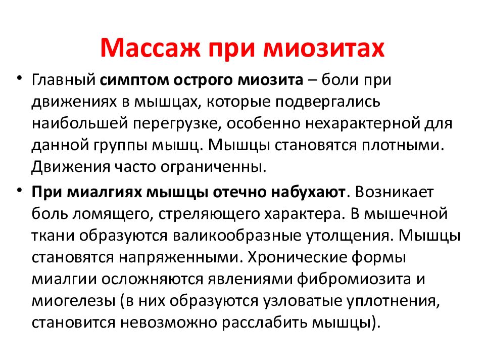 Главный симптом острого миозита – боли при движениях в мышцах, которые подвергались наибольшей перегрузке, особенно нехарактерной для данной группы мышц. Мышцы становятся плотными. Движения часто ограниченны. При миалгиях мышцы отечно набухают. Возникает боль ломящего, стреляющего характера. В мышечной ткани образуются валикообразные утолщения. Мышцы становятся напряженными. Хронические формы миалгии осложняются явлениями фибромиозита и миогелезы (в них образуются узловатые уплотнения, становится невозможно расслабить мышцы).