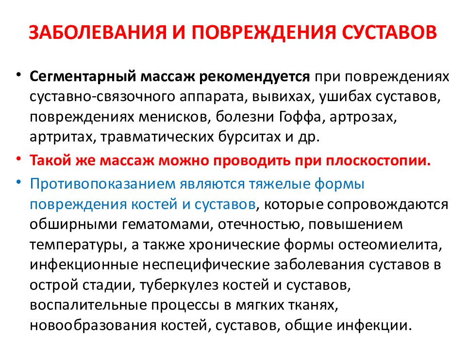 Сегментарный массаж рекомендуется при повреждениях суставно-связочного аппарата, вывихах, ушибах суставов, повреждениях менисков, болезни Гоффа, артрозах, артритах, травматических бурситах и др. Такой же массаж можно проводить при плоскостопии. Противопоказанием являются тяжелые формы повреждения костей и суставов, которые сопровождаются обширными гематомами, отечностью, повышением температуры, а также хронические формы остеомиелита, инфекционные неспецифические заболевания суставов в острой стадии, туберкулез костей и суставов, воспалительные процессы в мягких тканях, новообразования костей, суставов, общие инфекции.