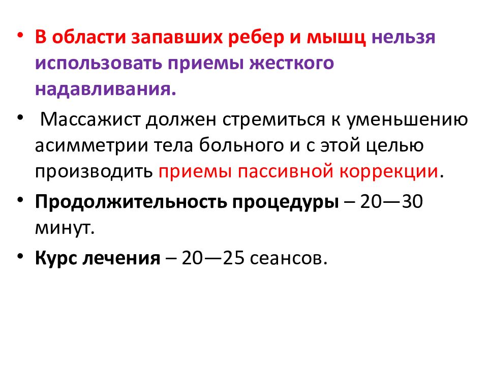 В области запавших ребер и мышц нельзя использовать приемы жесткого надавливания. Массажист должен стремиться к уменьшению асимметрии тела больного и с этой целью производить приемы пассивной коррекции. Продолжительность процедуры – 20—30 минут. Курс лечения – 20—25 сеансов.