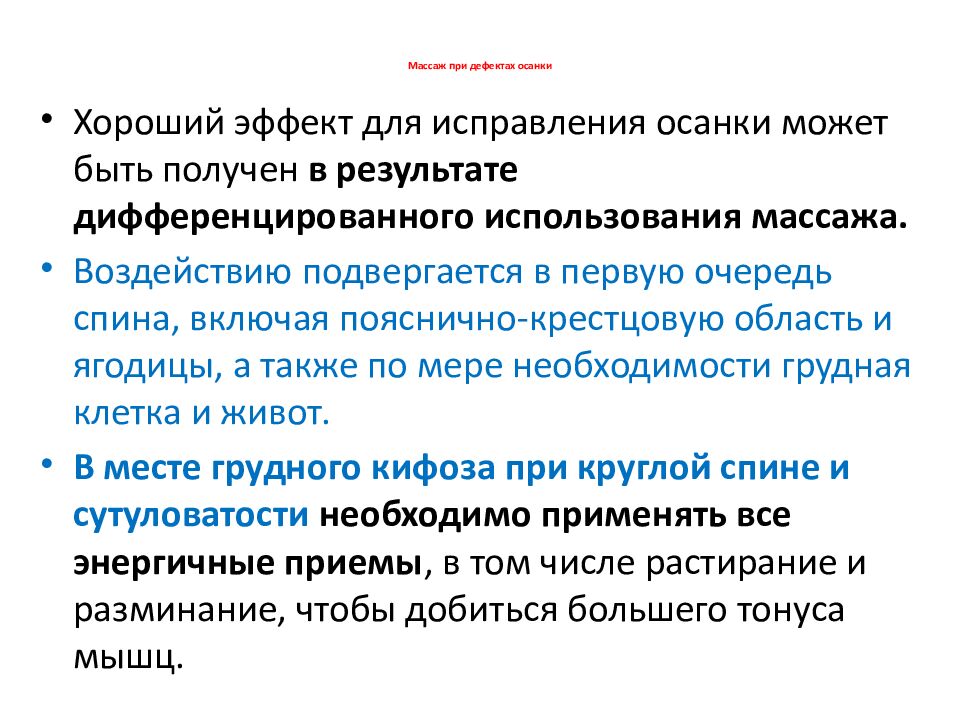 Хороший эффект для исправления осанки может быть получен в результате дифференцированного использования массажа. Воздействию подвергается в первую очередь спина, включая пояснично-крестцовую область и ягодицы, а также по мере необходимости грудная клетка и живот. В месте грудного кифоза при круглой спине и сутуловатости необходимо применять все энергичные приемы, в том числе растирание и разминание, чтобы добиться большего тонуса мышц.