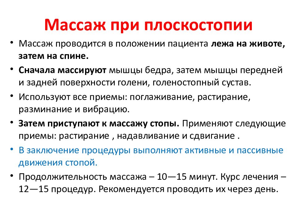 Массаж проводится в положении пациента лежа на животе, затем на спине. Сначала массируют мышцы бедра, затем мышцы передней и задней поверхности голени, голеностопный сустав. Используют все приемы: поглаживание, растирание, разминание и вибрацию. Затем приступают к массажу стопы. Применяют следующие приемы: растирание , надавливание и сдвигание . В заключение процедуры выполняют активные и пассивные движения стопой. Продолжительность массажа – 10—15 минут. Курс лечения – 12—15 процедур. Рекомендуется проводить их через день.