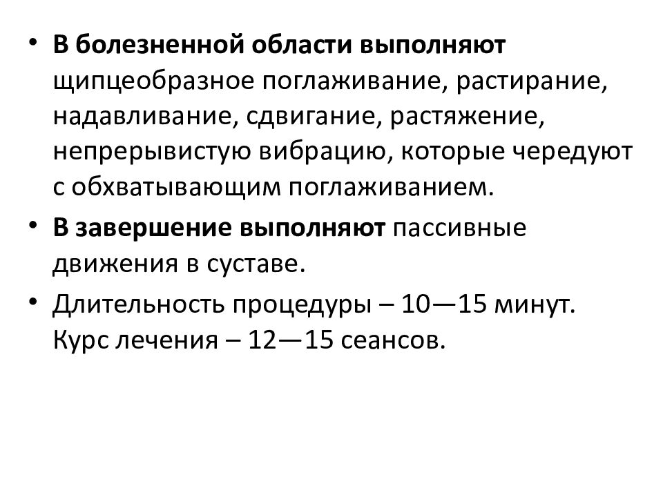 В болезненной области выполняют щипцеобразное поглаживание, растирание, надавливание, сдвигание, растяжение, непрерывистую вибрацию, которые чередуют с обхватывающим поглаживанием. В завершение выполняют пассивные движения в суставе. Длительность процедуры – 10—15 минут. Курс лечения – 12—15 сеансов.