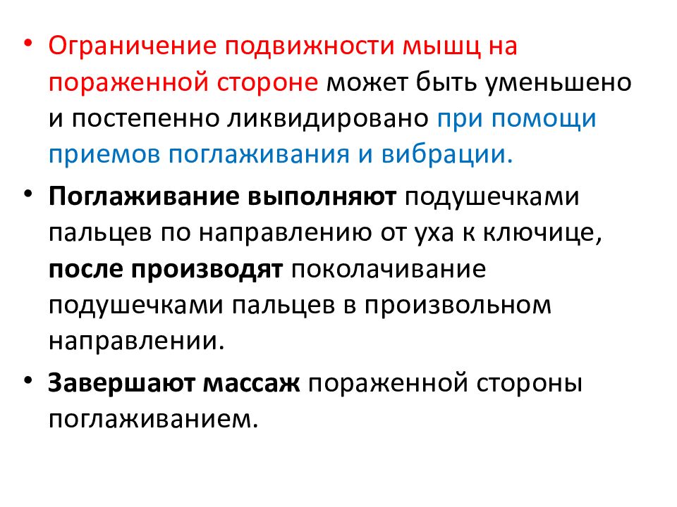 Ограничение подвижности мышц на пораженной стороне может быть уменьшено и постепенно ликвидировано при помощи приемов поглаживания и вибрации. Поглаживание выполняют подушечками пальцев по направлению от уха к ключице, после производят поколачивание подушечками пальцев в произвольном направлении. Завершают массаж пораженной стороны поглаживанием.