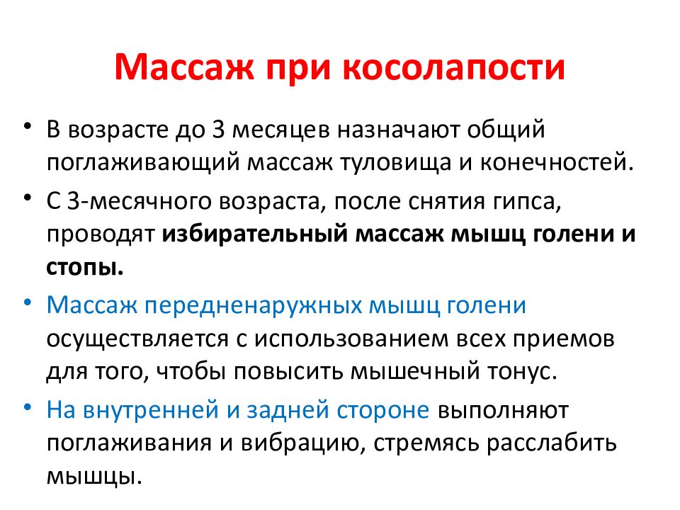 В возрасте до 3 месяцев назначают общий поглаживающий массаж туловища и конечностей. С 3-месячного возраста, после снятия гипса, проводят избирательный массаж мышц голени и стопы. Массаж передненаружных мышц голени осуществляется с использованием всех приемов для того, чтобы повысить мышечный тонус. На внутренней и задней стороне выполняют поглаживания и вибрацию, стремясь расслабить мышцы.