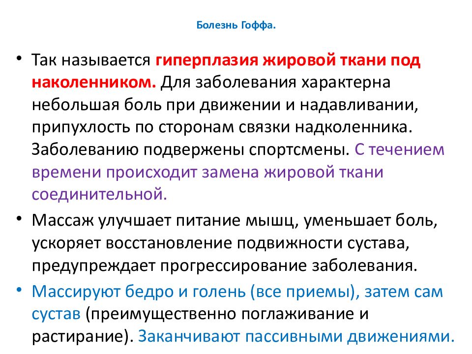 Последний слайд презентации: Массаж при заболеваниях ОДА: Болезнь Гоффа