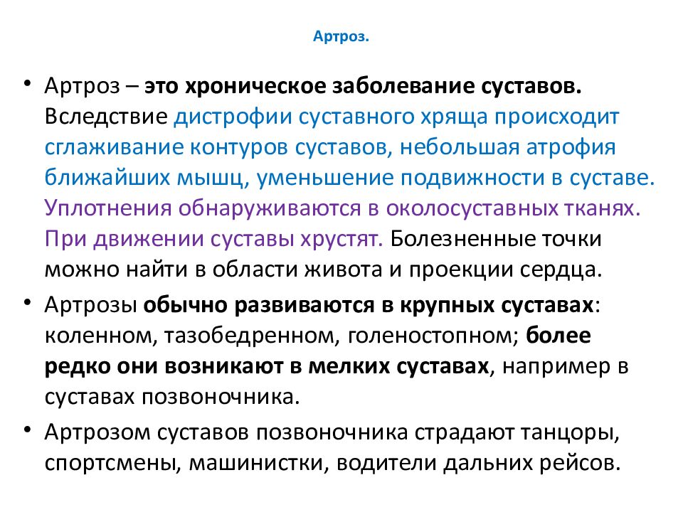 Артроз – это хроническое заболевание суставов. Вследствие дистрофии суставного хряща происходит сглаживание контуров суставов, небольшая атрофия ближайших мышц, уменьшение подвижности в суставе. Уплотнения обнаруживаются в околосуставных тканях. При движении суставы хрустят. Болезненные точки можно найти в области живота и проекции сердца. Артрозы обычно развиваются в крупных суставах : коленном, тазобедренном, голеностопном; более редко они возникают в мелких суставах, например в суставах позвоночника. Артрозом суставов позвоночника страдают танцоры, спортсмены, машинистки, водители дальних рейсов.