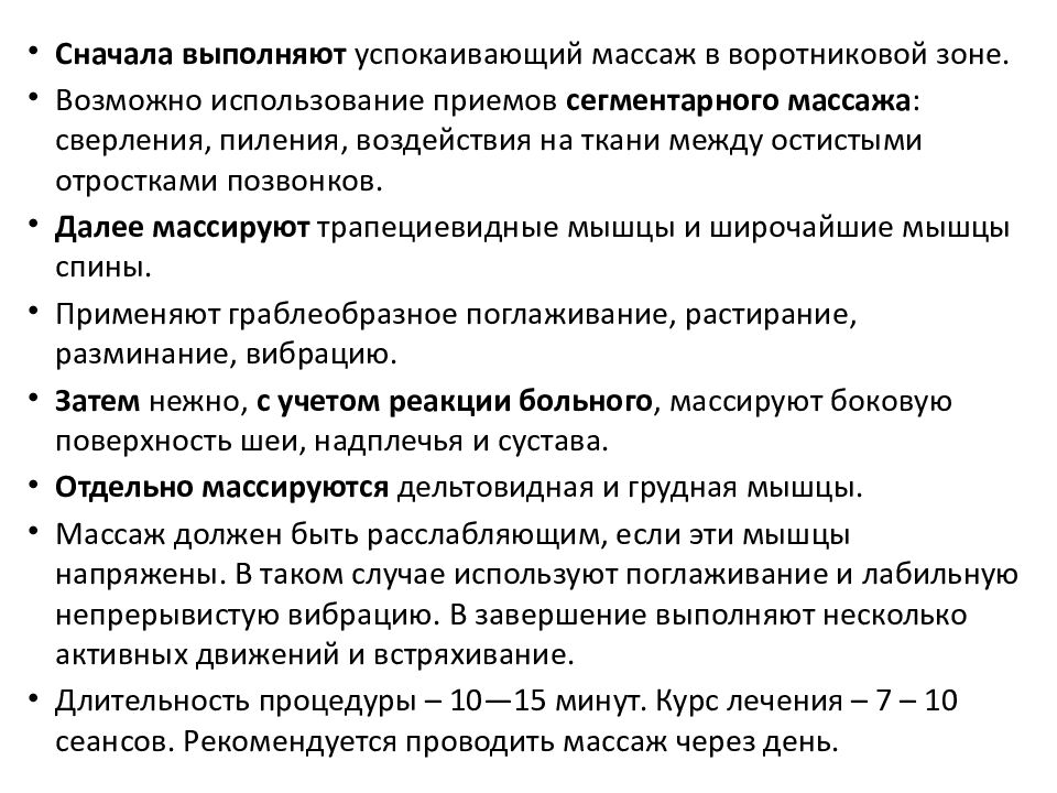 Сначала выполняют успокаивающий массаж в воротниковой зоне. Возможно использование приемов сегментарного массажа : сверления, пиления, воздействия на ткани между остистыми отростками позвонков. Далее массируют трапециевидные мышцы и широчайшие мышцы спины. Применяют граблеобразное поглаживание, растирание, разминание, вибрацию. Затем нежно, с учетом реакции больного, массируют боковую поверхность шеи, надплечья и сустава. Отдельно массируются дельтовидная и грудная мышцы. Массаж должен быть расслабляющим, если эти мышцы напряжены. В таком случае используют поглаживание и лабильную непрерывистую вибрацию. В завершение выполняют несколько активных движений и встряхивание. Длительность процедуры – 10—15 минут. Курс лечения – 7 – 10 сеансов. Рекомендуется проводить массаж через день.