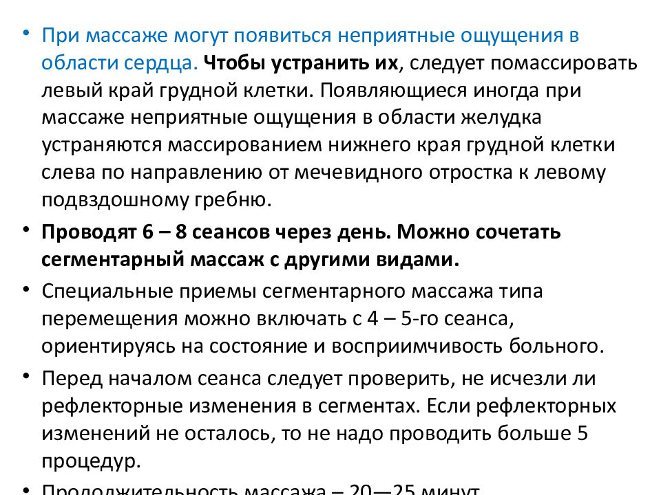 При массаже могут появиться неприятные ощущения в области сердца. Чтобы устранить их, следует помассировать левый край грудной клетки. Появляющиеся иногда при массаже неприятные ощущения в области желудка устраняются массированием нижнего края грудной клетки слева по направлению от мечевидного отростка к левому подвздошному гребню. Проводят 6 – 8 сеансов через день. Можно сочетать сегментарный массаж с другими видами. Специальные приемы сегментарного массажа типа перемещения можно включать с 4 – 5-го сеанса, ориентируясь на состояние и восприимчивость больного. Перед началом сеанса следует проверить, не исчезли ли рефлекторные изменения в сегментах. Если рефлекторных изменений не осталось, то не надо проводить больше 5 процедур. Продолжительность массажа – 20—25 минут.