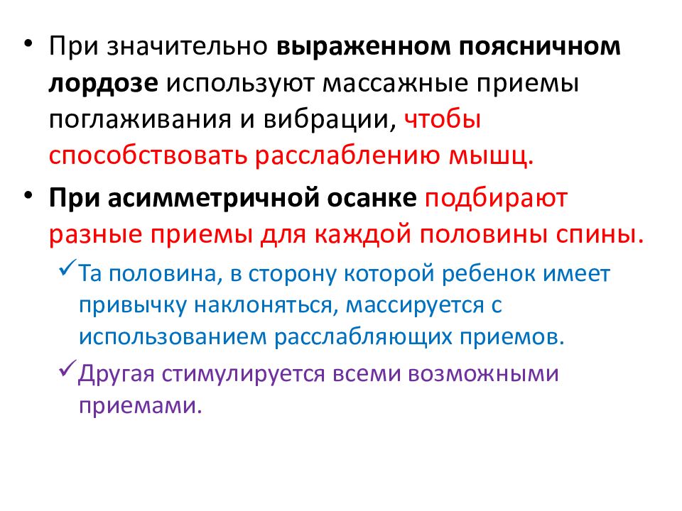 При значительно выраженном поясничном лордозе используют массажные приемы поглаживания и вибрации, чтобы способствовать расслаблению мышц. При асимметричной осанке подбирают разные приемы для каждой половины спины. Та половина, в сторону которой ребенок имеет привычку наклоняться, массируется с использованием расслабляющих приемов. Другая стимулируется всеми возможными приемами.