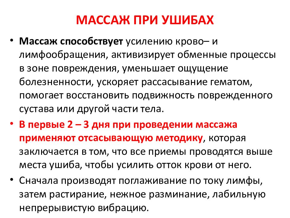 Массаж способствует усилению крово – и лимфообращения, активизирует обменные процессы в зоне повреждения, уменьшает ощущение болезненности, ускоряет рассасывание гематом, помогает восстановить подвижность поврежденного сустава или другой части тела. В первые 2 – 3 дня при проведении массажа применяют отсасывающую методику, которая заключается в том, что все приемы проводятся выше места ушиба, чтобы усилить отток крови от него. Сначала производят поглаживание по току лимфы, затем растирание, нежное разминание, лабильную непрерывистую вибрацию.