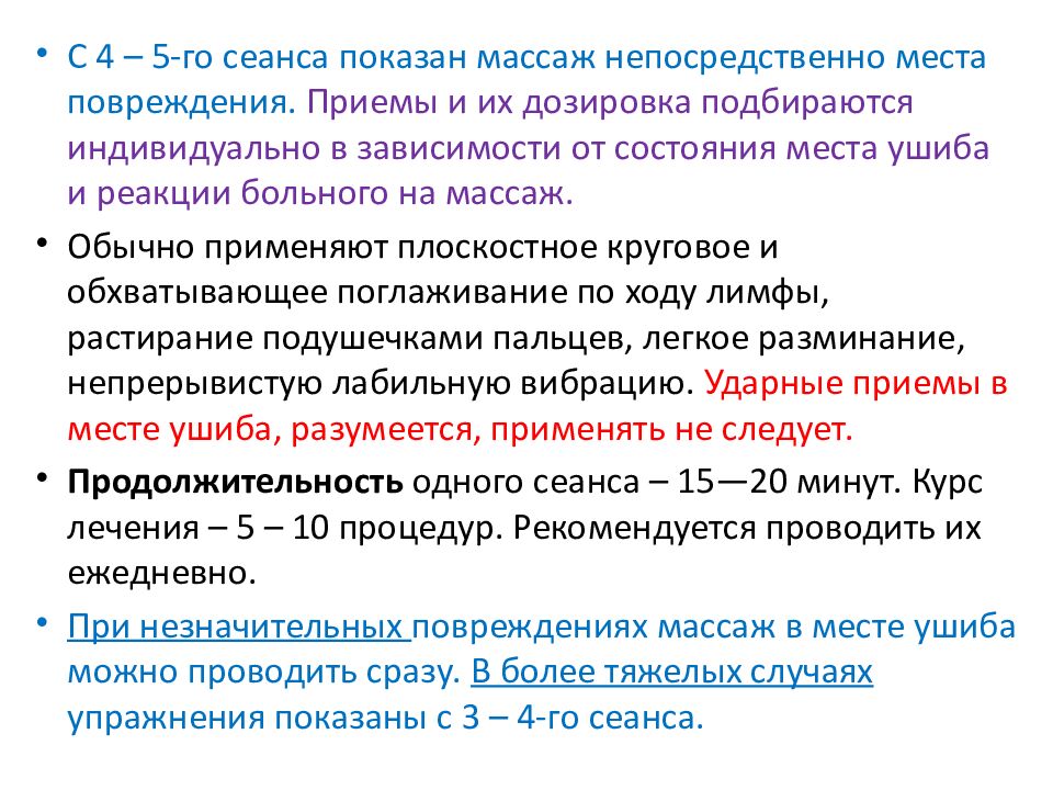 С 4 – 5-го сеанса показан массаж непосредственно места повреждения. Приемы и их дозировка подбираются индивидуально в зависимости от состояния места ушиба и реакции больного на массаж. Обычно применяют плоскостное круговое и обхватывающее поглаживание по ходу лимфы, растирание подушечками пальцев, легкое разминание, непрерывистую лабильную вибрацию. Ударные приемы в месте ушиба, разумеется, применять не следует. Продолжительность одного сеанса – 15—20 минут. Курс лечения – 5 – 10 процедур. Рекомендуется проводить их ежедневно. При незначительных повреждениях массаж в месте ушиба можно проводить сразу. В более тяжелых случаях упражнения показаны с 3 – 4-го сеанса.