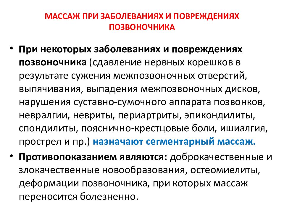 При некоторых заболеваниях и повреждениях позвоночника ( сдавление нервных корешков в результате сужения межпозвоночных отверстий, выпячивания, выпадения межпозвоночных дисков, нарушения суставно-сумочного аппарата позвонков, невралгии, невриты, периартриты, эпикондилиты, спондилиты, пояснично-крестцовые боли, ишиалгия, прострел и пр.) назначают сегментарный массаж. Противопоказанием являются: доброкачественные и злокачественные новообразования, остеомиелиты, деформации позвоночника, при которых массаж переносится болезненно.