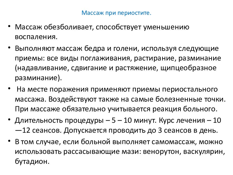 Массаж обезболивает, способствует уменьшению воспаления. Выполняют массаж бедра и голени, используя следующие приемы: все виды поглаживания, растирание, разминание (надавливание, сдвигание и растяжение, щипцеобразное разминание ). На месте поражения применяют приемы периостального массажа. Воздействуют также на самые болезненные точки. При массаже обязательно учитывается реакция больного. Длительность процедуры – 5 – 10 минут. Курс лечения – 10—12 сеансов. Допускается проводить до 3 сеансов в день. В том случае, если больной выполняет самомассаж, можно использовать рассасывающие мази: венорутон, васкулярин, бутадион.