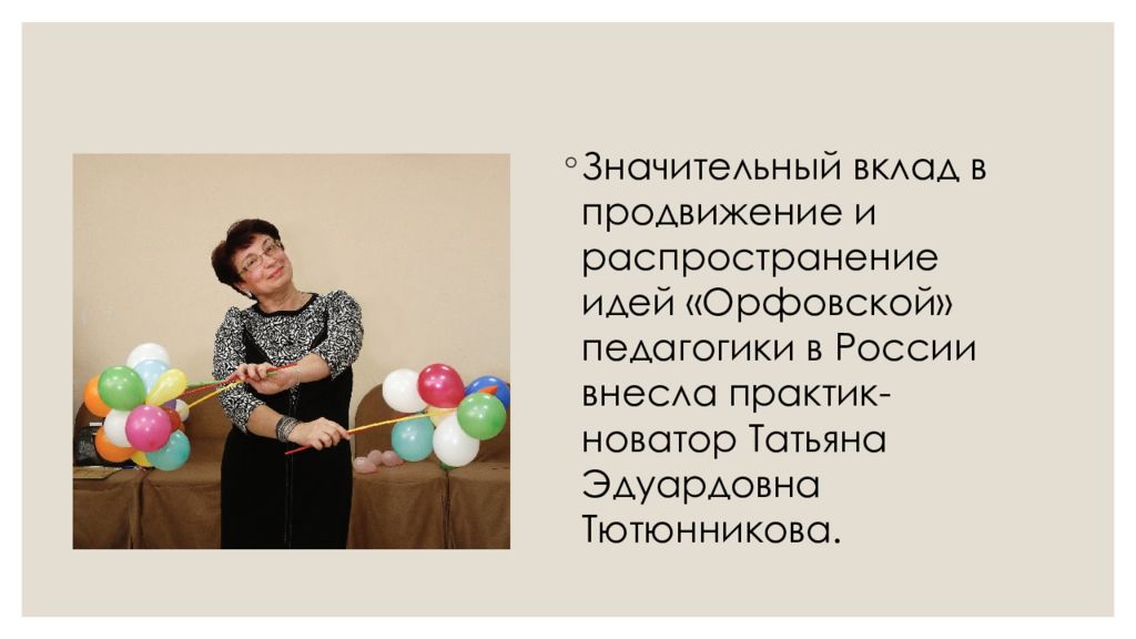 Значительный вклад в продвижение и распространение идей « Орфовской » педагогики в России внесла практик-новатор Татьяна Эдуардовна Тютюнникова.