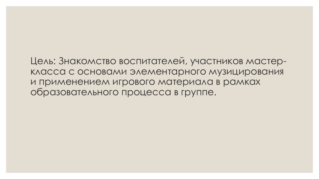 Слайд 3: Цель: Знакомство воспитателей, участников мастер-класса с основами элементарного музицирования и применением игрового материала в рамках образовательного процесса в группе