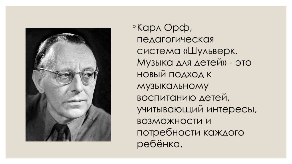 Карл Орф, педагогическая система « Шульверк. Музыка для детей» - это новый подход к музыкальному воспитанию детей, учитывающий интересы, возможности и потребности каждого ребёнка.
